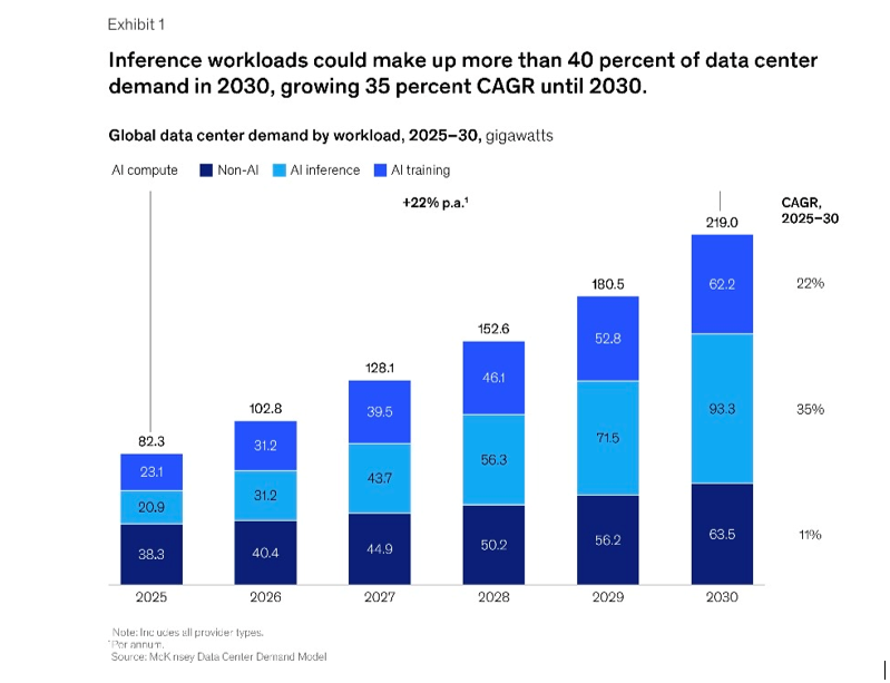 That’s important because we can see the workloads shifting to AI inference. Here is some data from McKinsey & Co on this. They predict that inference workloads will surpass training workloads by 2030. It will become 30-40% of total data center demand.