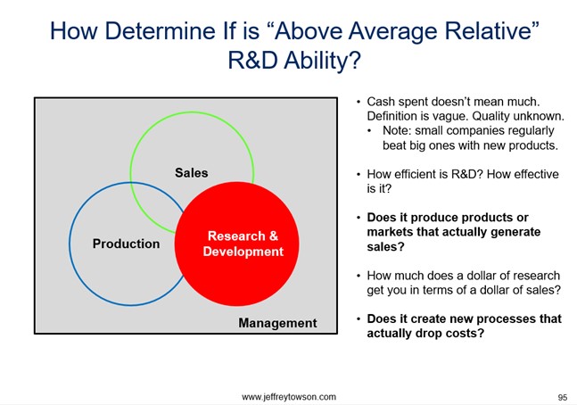 I mentioned that 50% of their staff are in R&D. But the trick with R&D is that performance is not the same as headcount or money spent. Small teams often outperform larger ones. Here is Phil Fisher’s framework for assessing R&D.