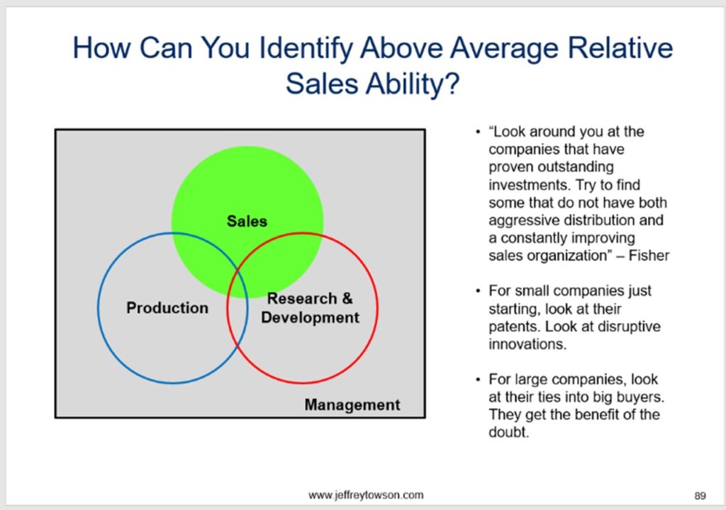 Warren Buffett mentor Philip Graham actually laid out a good framework for this back in the 1950’s. When he was looking at technology companies (Hewlett Packard and Motorola), he would look for both superior R&D capabilities and superior sales capabilities.