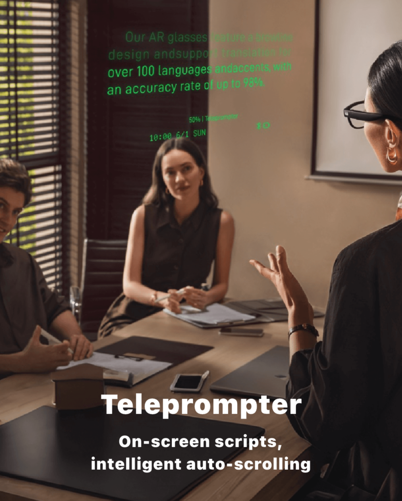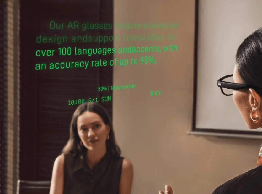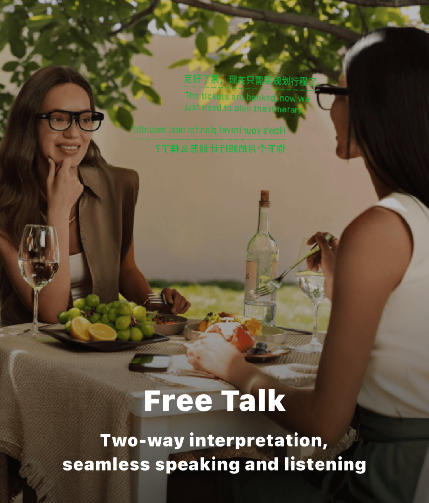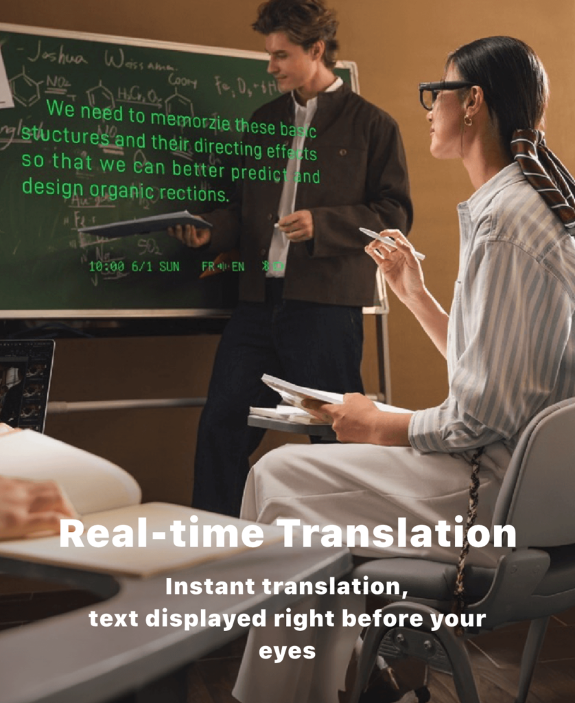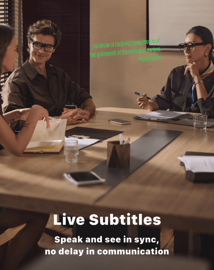 A: Leion AR glasses overlay digital information onto the user’s field of view and are specifically optimized for real-time transcription and translation, displaying bright green subtitles across the lenses. -
